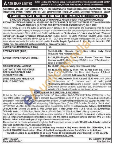 All that the Part and parcel of the Residential Flat No. 107, Municipal Door No.2-5-27/S/107(PTIN No. 1060203256) on First Floor of the building known "Sajid Plaza in premises beaning Plot Nos 39, 50,51 & 52 in survey No.32,33% 34/Part with a plinth area of 703 Square feets, RCC induding common area and One car Parking admeasuring 100 Square Feet in stilt Floor, along with a undivided share of Land admeasuring 21.00 Square Yands (Out of 1012 Sq Yrds), Situated at "Ashok Vihar UPPERPALLY VILLAGE, GHMC Rajendranagar Circle. Ranga Reddy District, TS and bounded as follows:- BOUNDARIES OF FLAT: North: Open to Sky: South: 7 wide Corridor, East: 4' wide Comidor: West Lift & Flat No. 106. BOUNDARIES OF LAND: North: 30 Wide Road, South: Plot No.40 & 49, East: 35 Wide Road, West: Happy Homes Apts