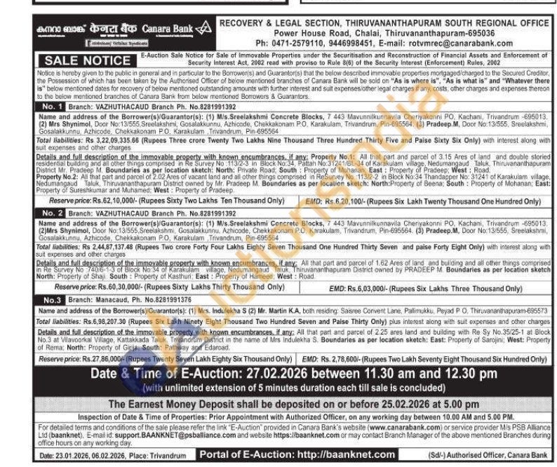 Details and full description of the immovable property with known encumbrances, if any, All that part and parcel of 2.25 ares land and building with Re Sy No.35/25-1 at Block No.3 at Vilavoorkal Village, Kattakkada Taluk, Trivandrum District in the name of Mrs Indulekha S. Boundaries as per location sketch: East: Property of Sarojini West: Property of Rema: North: Property of Ginija, South: Pathway and Edaroad.