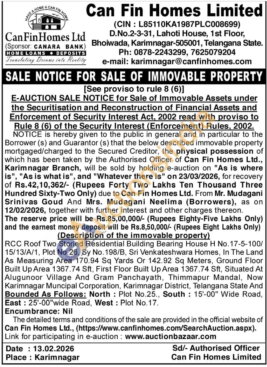 Description of the immovable property : RCC Roof Two Storied Residential Building Bearing House H No.17-5-100/15/13/A/1, Plot No.26, Sy No. 198/B, Sri Venkateshwara Homes, In The Land As Measuring Area 170.94 Sq Yards Or 142.92 Sq Meters, Ground Floor Built Up Area 1367.74 Sft, First Floor Built Up Area 1367.74 Sft, Situated At Alugunoor Village And Gram Panchayath, Thimmapur Mandal, Now Karimnagar Muncipal Corporation, Karimnagar District, Telangana State And Bounded As Follows: North: Plot No.25., South 15'-00" Wide Road, East: 25'-00"wide Road, West: Plot No.17