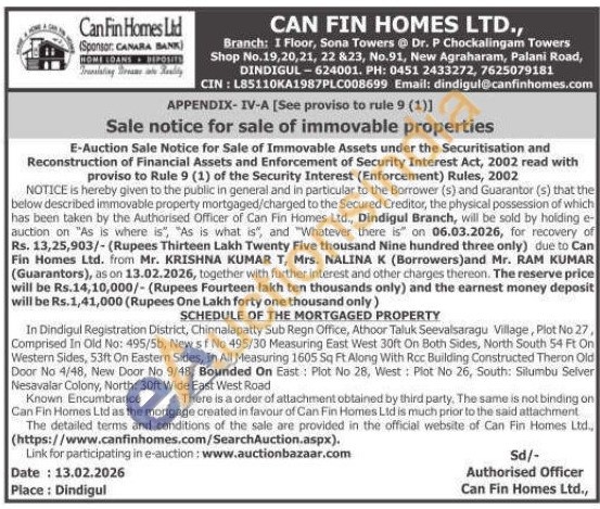 SCHEDULE OF THE MORTGAGED PROPERTY : In Dindigul Registration District, Chinnalapatty Sub Regn Office, Athoor Taluk Seevalsaragu Village, Plot No 27, Comprised In Old No: 495/5b, New s f No 495/30 Measuring East West 30ft On Both Sides, North South 54 Ft On Western Sides, 53ft On Eastern Sides, In All Measuring 1605 Sq Ft Along With Rcc Building Constructed Theron Old Door No 4/48, New Door No 9/48, Bounded On East: Plot No 28, West: Plot No 26, South: Silumbu Selver Nesavalar Colony, North: 30ft Wide East West Road