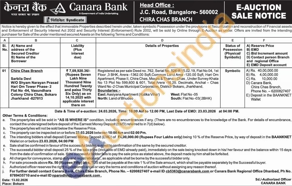 Registered as per sale Deed no.762, Serial No. 826 dt 15.02.19, Flat No 04, 1st Floor, 3 BHK, Arera -1362.00 Sqft, Common Land Area-120.00 Sqft, Hari Om Apartment, Phase II, Chira Chas, Mouza & Thana-Chas, Under Survey Khata No 13 Plot No 599,600 & 601, Total Arera -16.25. Decimals, Anchal Chas Ward No-2 Chas Municipal Corporation, District-Bokaro, Jharkhand.