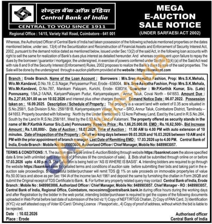 Erode Branch: Mobile No: 8489903006 / Authorized Officer/Chief Manager Mobile No: 8489903057