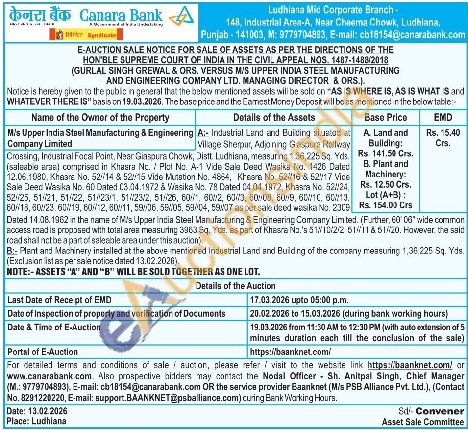 B:- Plant and Machinery installed at the above mentioned Industrial Land and Building of the company measuring 1,36,225 Sq. Yds. (Exclusion list as per sale notice dated 13.02.2026).
