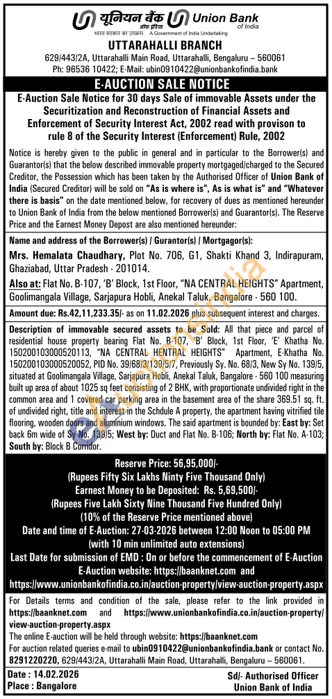 residential house property bearing Flat No. B-107, 'B' Block, 1st Floor, E' Khatha No. 150200103000520113, "NA CENTRAL HENTRAL HEIGHTS" Apartment, E-Khatha No. 150200103000520052, PID No. 39/68/3/139/5/7, Previously Sy. No. 68/3, New Sy No. 139/5, situated at Goolimangala Village, Sarjapura Hobli, Anekal Taluk, Bangalore-560 100 measuring built up area of about 1025 sq feet consisting of 2 BHK, with proportionate undivided right in the common area and 1 covered car parking area in the basement area of the share 369.51 sq. ft. of undivided right, title and interest in the Schdule A property, the apartment having vitrified tile flooring, wooden doors and aluminium windows. The said apartment is bounded by: East by: Set back 6m wide of Sy No. 139/5; West by: Duct and Flat No. B-106; North by: Flat No. A-103; South by: Block B Corridor