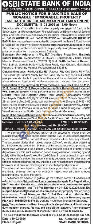 Description of the Immovable Property: Regd. Sale Deed Doc.No.1161/2019, Dated. 18.03.2019, Property Belongs to Smt. Bathula Santhi Kumari, W/o. Bathula Suresh: All the part and parcel of the property at Prakasam District, Podili Sub-Registrar Office, Podili Mandal, Uppalapadu Village Panchayath, Patta No.677, Sy.No.252/1H, an extent of Ac. 0.35 cents, Sy No.252/28, an extent of Ac.0.55 cents, both combined as Ac.0.90 cents (35+55=90 cents) having constructed ACC roof shed Boundaries: East: Pathway, South: Land belongs to Pendala Yerra Venkaiah, West: Land belongs to Pendala Yerra Lakshmamma, North: Land belongs to Buraka Guravaiah