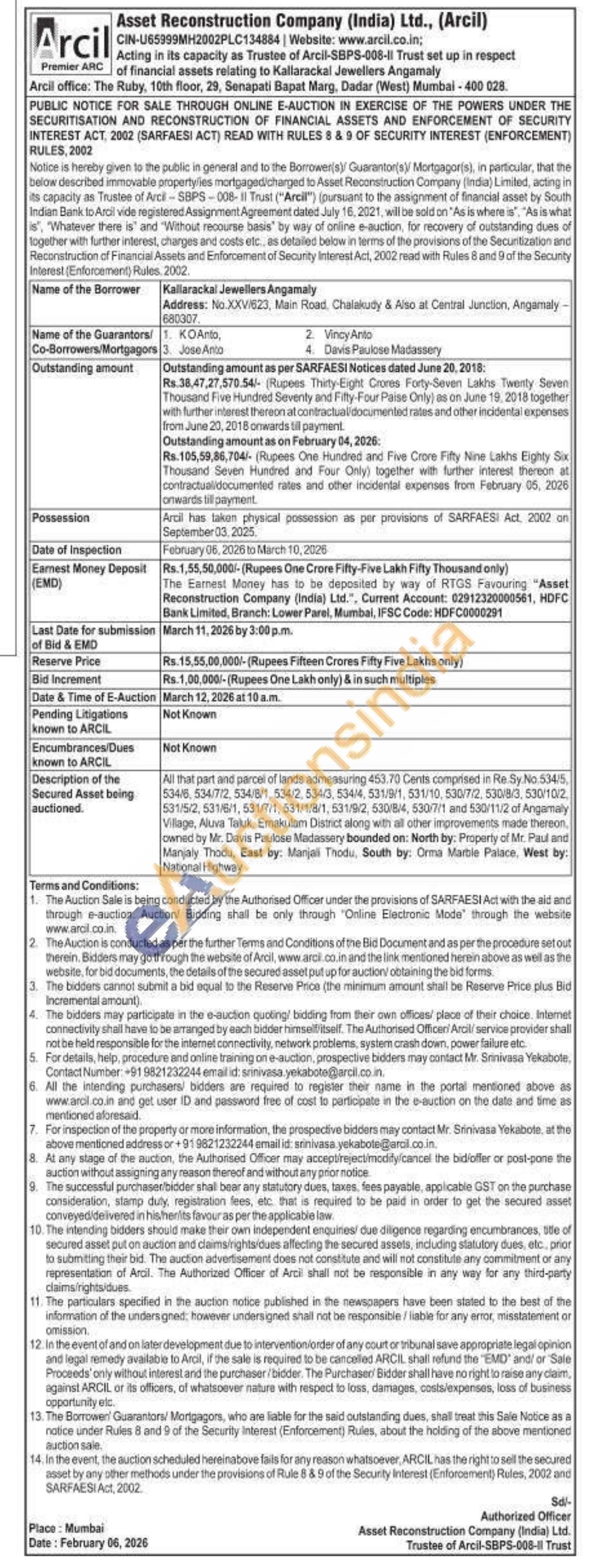 All that part and parcel of lands admeasuring 453.70 Cents comprised in Re Sy. No. 534/5, 534/6, 534/7/2, 534/8/1, 534/2, 534/3, 534/4, 531/9/1, 531/10, 530/7/2, 530/8/3, 530/10/2 531/5/2, 531/6/1, 531/7/1, 531/1/8/1, 531/9/2, 530/8/4, 530/7/1 and 530/11/2 of Angamaly Village, Aluva Taluk, Ernakulam District along with all other improvements made thereon, owned by Mr. Davis Paulose Madassery bounded on: North by: Property of Mr. Paul and Manjaly Thodu, East by: Manjali Thodu, South by: Orma Marble Palace, West by: National Highway