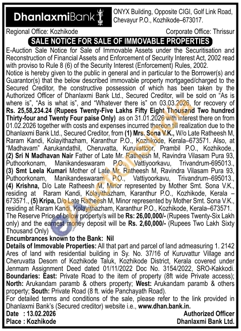 Details of Immovable Properties: All that part and parcel of land admeasuring 1. 2142 Ares of land with residential building in Sy. No. 37/16 of Kuruvattur Village and Cheruvatta Desom of Kozhikode Taluk, Kozhikode District, Kerala covered under Jenmam Assignment Deed dated 01/11/2022 Doc No. 3154/2022, SRO-Kakkodi. Boundaries: East: Private Road to the item of property (8ft wide Private access); North: Arukandam paramb & others property; West: Arukandam paramb & others property; South: Private Road (8 ft. wide Panchayath Road).