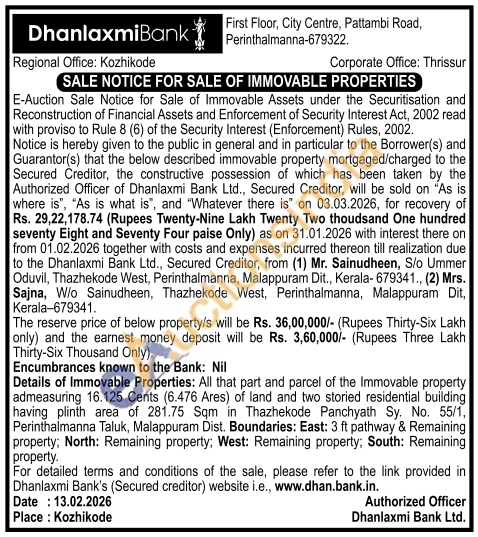 Details of Immovable Properties: All that part and parcel of the Immovable property admeasuring 16.125 Cents (6.476 Ares) of land and two storied residential building having plinth area of 281.75 Sqm in Thazhekode Panchyath Sy. No. 55/1, Perinthalmanna Taluk, Malappuram Dist. Boundaries: East: 3 ft pathway & Remaining property; North: Remaining property; West: Remaining property; South: Remaining property.