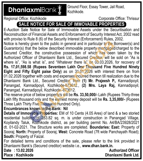 Details of Immovable Properties: EM of 10 Cents (4.05 Ares) of land & a two storied residential building of 253.82 sq. m. is under construction in Panangad Village, Koyilandy Taluk, Kozhikode district, as per building permit No. A4/BA/23928/2021 dt. 01-02-2021. The Structure works are completed. Boundaries: East: Property of Sooraj; North: Property of Sooraj; West: Concrete Road (7ft wide Panchayath Road); South: Property of Faizal.