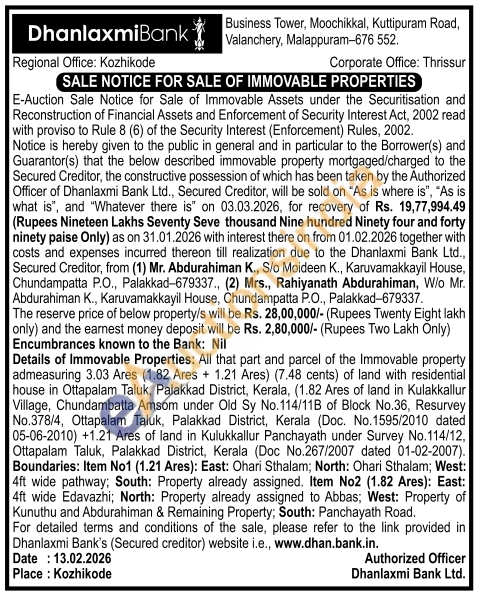 Details of Immovable Properties: All that part and parcel of the Immovable property admeasuring 3.03 Ares (1.82 Ares + 1.21 Ares) (7.48 cents) of land with residential house in Ottapalam Taluk, Palakkad District, Kerala, (1.82 Ares of land in Kulakkallur Village, Chundambatta Amsom under Old Sy No.114/11B of Block No.36, Resurvey No.378/4, Ottapalam Taluk, Palakkad District, Kerala (Doc. No.1595/2010 dated 05-06-2010) +1.21 Ares of land in Kulukkallur Panchayath under Survey No.114/12, Ottapalam Taluk, Palakkad District, Kerala (Doc No.267/2007 dated 01-02-2007). Boundaries: Item No1 (1.21 Ares): East: Ohari Sthalam; North: Ohari Sthalam; West: 4ft wide pathway; South: Property already assigned. Item No2 (1.82 Ares): East: 4ft wide Edavazhi; North: Property already assigned to Abbas; West: Property of Kunuthu and Abdurahiman & Remaining Property; South: Panchayath Road