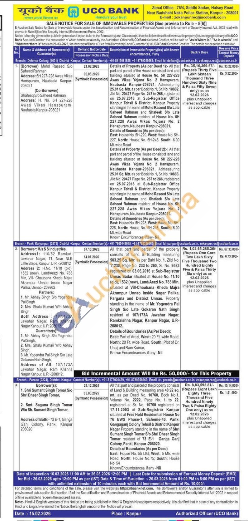 All that part and parcel of the property consists of Land & Building measuring area 40.92 sq. mt. as per Deed No. 10760, Book No.1, Volume No. 2222, Page No. 1 to 22. registered at Sr. No. 10760 registered on 17.11.2003 at Sub-Registrar Kanpur situated at Free Hold Residential House No 76 EWS Phase-1, Scheme-40, Panki Gangaganj Colony Tehsil & District Kanpur Nagar Property standing in the name of Shri Sumant Singh Tomar S/o Shri Dheer Singh Tomar resident of 73 E-1 Ganga Ganj Colony, Panki, Kanpur-208020. Details of Boundaries (As per Deed) East: House No. 55 LIG; West: 5 Mtr, wide Road, North: House No.75; South: House No. 54 Known Encumbrances, if any-Nil