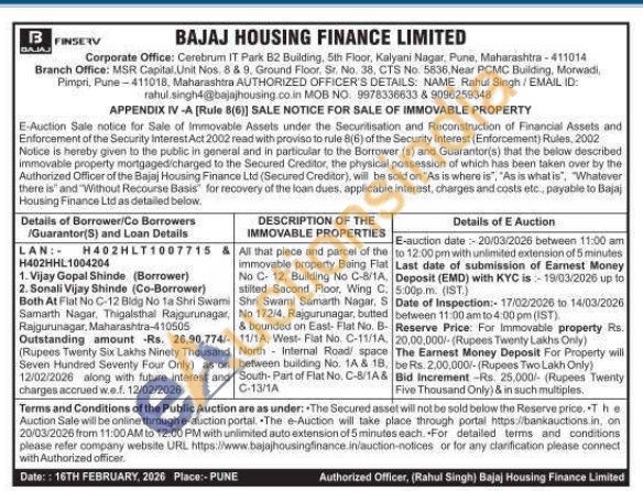 All that piece and parcel of the immovable property Being Flat No C-12, Building No C-8/1A, stilted Second Floor, Wing C. Shri Swami Samarth Nagar, S No 172/4, Rajgurunagar, butted & bounded on East- Flat No. B-11/1A, West-Flat No. C-11/1A North Internal Road space between building No. 1A & 18. South-Part of Flat No. C-8/1A& C-13/1A