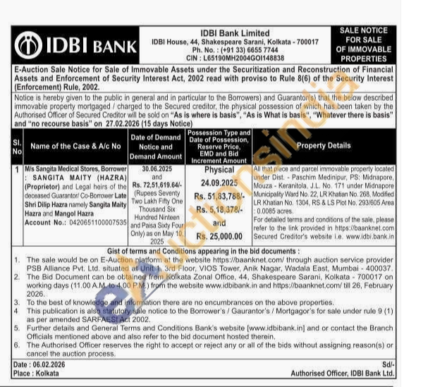 All that piece and parcel immovable property located under Dist. Paschim Medinipur, PS: Midnapore, Mouza-Keranitola, J.L. No. 171 under Midnapore Municipality Ward No. 22, LR Khatian No. 268, Modified LR Khatian No. 1304, RS & LS Plot No. 293/605 Area 0.0085 acres For detailed terms and conditions of the sale, please refer to the link provided in https://baanknet.com Secured Creditor's website i.e. www.idbi.bank.in