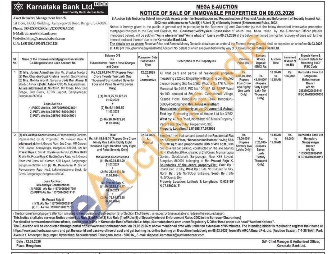 Item No.1:- All that part and parcel of the Residential Flat No.1, Ground Floor, "Banashankari Homes" having SBA of 1080 sq.ft. and proportionate UDS of 410 sq.ft., with one covered car parking, constructed on the site bearing No. 4, Khata No.207/A, situated at 2nd Cross. Muniramappa Garden, Geddalahalli, Sanjaynagar, Near KEB Layout, Bengaluru-560094 belonging to Mr. Prasad Raju K. Boundaries of the entire property/Flat: East By: Road Open to Sky, West By: Site No. 16/Open to Sky, North By: Site No.3/Door Entrance, South By: Site no 5