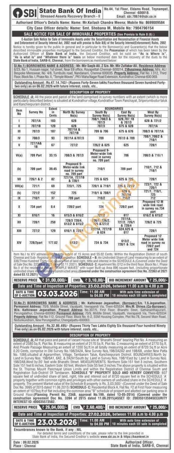SCHEDULE-A: All that piece and parcel of Vacant House site at "Bharathi Street' bearing Plot No. A measuring an extent of 2580 Sq. ft, Plot No. B measuring an extent of 2170 Sq.ft, Plot No. C measuring an extent of 2770 Sq.ft. And Private Passage Measuring an extent of 1200 Sq.ft.In all totally measuring an extent of 8720 Sq.ft or Acre 0.20 Cents, comprise in Old Survey No. 198/2A2A, New Survey Nos. 198/2A2A2 and 198/68, under New Patta No. 1066, situated at Agaramthen, Village, Tambaram Taluk, Kancheepuram District, BOUNDARIES:North by: Land in Survey Nos. 198/6A1, 6A2, & 2A2A1South by: Land in Survey Nos, 198/1East by: Land in Survey Nos. 198/2AB, West by:20 feet wide Bharathi Street. MEASUREMENTS: Northern Side: 151 feet 3 inches, Southern Side: 151 feet 6 inches, Eastern Side: 60 feet, Western Side:55 feet 3 inches. The above property is situated within the St. Thomas Mount Panchayat Union Limits and within the Registration District of Chennai South and Registration Sub-District Of Tambaram. SCHEDULE "B" PROPERTY SOLD AND HEREBY CONVEYED: 607 square feet of undivided share of land, right, title and interest out of 8720 square feet in the SCHEDULE 'A property together with common rights and privileges with other owners of undivided share in the SCHEDULE A property. The present Market value of the Schedule 8 property is Rs. 3,03,500/-(Covered under the Deed of Sale Doc No. 3995 of 2015 dated 11.06.2015) SCHEDULE-C: Residential Block A, Flat No. F2 at First Floor measuring an extent of 1075sq.ft of flat including the common area "B" schedule of propert and allotted car parking area in Ground Floor (Planning Permit No. 2348, approval No.199, dated 13-05-2014) (Covered under the construction agreement Doc No. 3394 of 2015 dated 11.06.2015)ASSET ID: 20035513594SECURITY INTEREST ID: 400035573582.