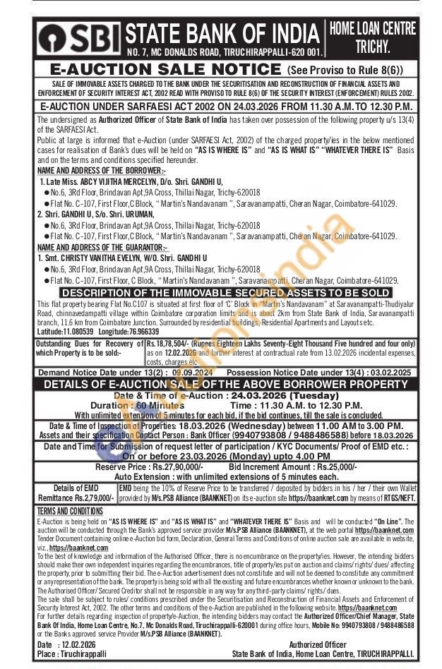 This flat property bearing Flat No.C107 is situated at first floor of 'C' Block in "Martin's Nandavariam" at Sar avariampatti-Thudiyalur Road, chinnavedampatti village within Coimbatore corporation limits and is about 2km from State Bank of India, Saravanampatti branch, 11.6 km from Coimbatore Junction. Surrounded by residential buildings, Residential Apartments and Layouts etc. Latitude: 11.080539 Longitude: 76.966339