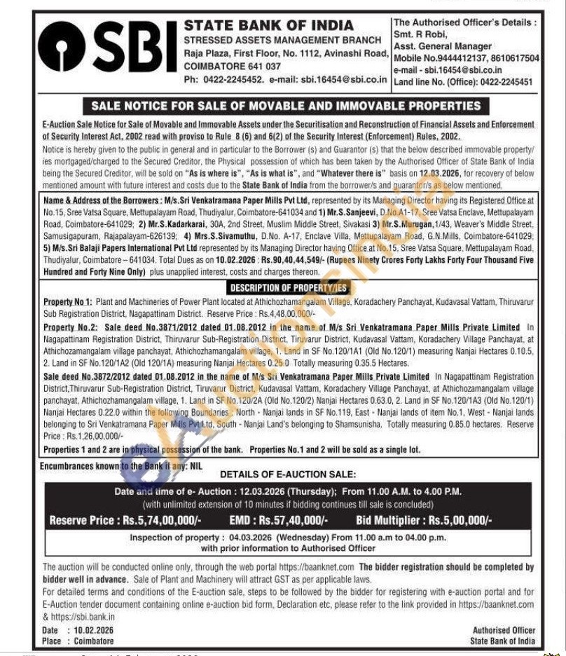 Property No 1: Plant and Machineries of Power Plant located at Athichozhamangalam Village, Koradachery Panchayat, Kudavasal Vattam, Thiruvarur Sub Registration District, Nagapattinam District. Reserve Price: Rs. 4,48,00,000/- Property No.2: Sale deed No.3871/2012 dated 01.08.2012 in the name of M/s Sri Venkatramana Paper Mills Private Limited In Nagapattinam Registration District, Thiruvarur Sub-Registration District, Tiruvarur District, Kudavasal Vattam, Koradachery Village Panchayat, at Athichozamangalam village panchayat, Athichozhamangalam village, 1. Land in SF No.120/1A1 (Old No.120/1) measuring Nanjai Hectares 0.10.5, 2. Land in SF No.120/1A2 (Old 120/1A) measuring Nanjai Hectares 0.25.0. Totally measuring 0.35.5 Hectares. Sale deed No.3872/2012 dated 01.08.2012 in the name of M/s Sri Venkatramana Paper Mills Private Limited In Nagapattinam Registration District, Thiruvarur Sub-Registration District, Tiruvarur District, Kudavasal Vattam, Koradachery Village Panchayat, at Athichozamangalam village panchayat, Athichozhamangalam village, 1. Land in SF No. 120/2A (Old No. 120/2) Nanjai Hectares 0.63.0, 2. Land in SF No.120/1A3 (Old No.120/1) Nanjai Hectares 0.22.0 within the following Boundaries: North Nanjai lands in SF No.119, East Nanjai lands of item No.1, West - Nanjai lands belonging to Sri Venkatramana Paper Mills Pvt Ltd, South - Nanjai Land's belonging to Shamsunisha. Totally measuring 0.85.0 hectares. Reserve Price: Rs.1,26,00,000/-