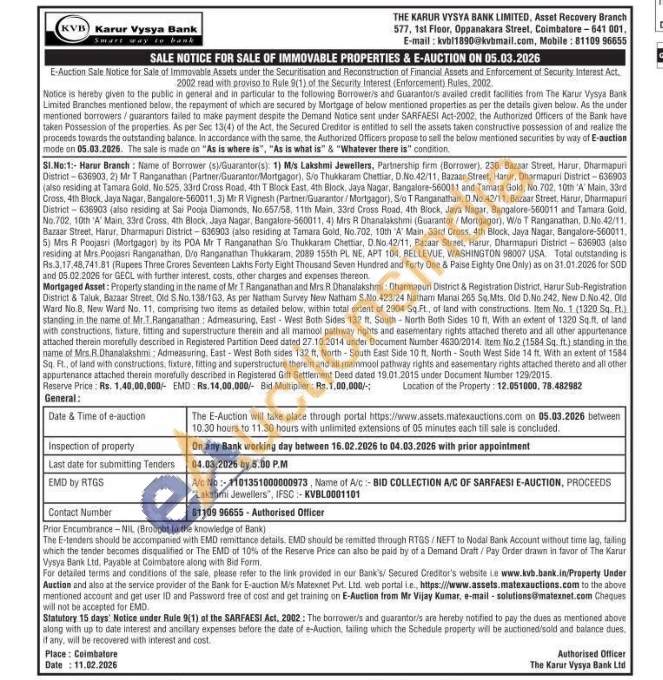 Mortgaged Asset: Property standing in the name of Mr. T. Ranganathan and Mrs. R. Dhanalakshmi: Dharmapuri District & Registration District, Harur Sub-Registration District & Taluk, Bazaar Street, Old S.No. 138/163, As per Natham Survey New Natham S.No.423/24 Natham Mariai 265 Sq.Mts. Old D.No.242, New D.No.42, Old Ward No.8, New Ward No. 11, comprising two items as detailed below, within total extent of 2904 Sq.Ft., of land with constructions. Item No. 1 (1320 Sq. Ft.). standing in the name of Mr.T.Ranganathan: Admeasuring, East-West Both Sides 132 ft. South-North Both Sides 10 ft. With an extent of 1320 Sq.ft. of land with constructions, fixture, fitting and superstructure therein and all mamool pathway rights and easementary rights attached thereto and all other appurtenance attached therein morefully described in Registered Partition Deed dated 27.10.2014 under Document Number 4630/2014. Item No.2 (1584 Sq. ft.) standing in the name of Mrs.R.Dhanalakshmi: Admeasuring. East-West Both sides 132 ft, North-South East Side 10 ft. North-South West Side 14 ft. With an extent of 1584 Sq. Ft., of land with constructions, fixture, fitting and superstructure therein and all mammool pathway rights and easementary rights attached thereto and all other appurtenance attached therein morefully described in Registered Gift Settlement Deed dated 19.01.2015 under Document Number 129/2015.