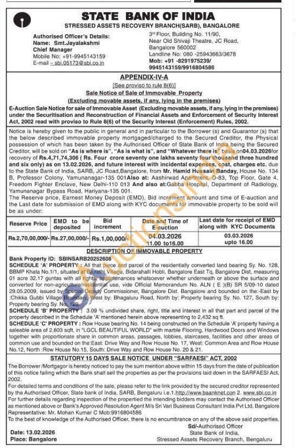 SCHEDULE 'A' PROPERTY: All that piece and parcel of the residentially converted land bearing Sy. No. 128. BBMP Khata No. 1/1, situated at Bairathi Village, Bidarahalli Hobli, Bangalore East Tq. Bangalore Dist, measuring 01 acre 32.17 guntas with all rights, appurtenances whatsoever whether underneath or above the surface and converted for non-agriculture/residential use, vide Official Memorandum No. ALN (E)(B) SR 5/09-10 dated 29.05.2009, issued by Special Deputy Commissioner, Bangalore Dist. Bangalore and bounded on the:-East by Chikka Gubbi Village Boundary, West by: Bhagaluru Road, North by: Property bearing Sy No. 127, South by: Property bearing Sy. No. 129. SCHEDULE 'B' PROPERTY: 3.09% undivided share, right, title and interest in all that part and parcel of the property described in the Schedule 'A' mentioned herein above representing to 2,432 sq ft. SCHEDULE 'C' PROPERTY: Row House bearing No. 14 being constructed on the Schedule 'A' property having a saleable area of 2,803 sqft, in "LGCL BEAUTIFUL WORLD" with marble Flooring, Hardwood Doors and Windows together with proportionate share in common areas, passages, lobbies, staircases, facilities and other areas of common use and bounded on the East: Drive Way and Row House No. 17, West: Common Area and Row House No. 12, North Row House No. 15, South: Drive Way and Row House No. 20 & 21.