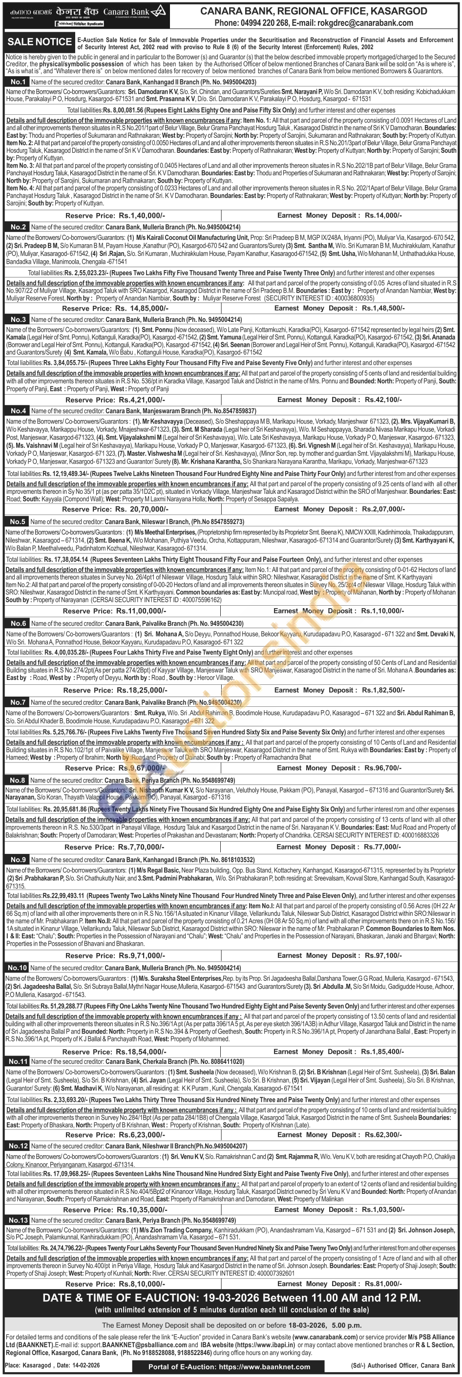 Details and full description of the immovable properties with known encumbrances if any: Item No.1: All that part and parcel of the property consisting of 0-01-62 Hectors of land and all improvements thereon situates in Survey No. 26/4pt1 of Nileswar Village, Hosdurg Taluk within SRO: Nileshwar, Kasaragod District in the name of Smt. K Karthyayani Item No.2: All that part and parcel of the property consisting of 0-00-20 Hectors of land and all improvements thereon situates in Survey No. 25/3pt4 of Nileswar Village, Hosdurg Taluk within SRO: Nileshwar, Kasaragod District in the name of Smt. K Karthyayani. Common boundaries as: East by: Muncipal road, West by: Property of Mahanan, North by: Property of Mohanan South by: Property of Narayanan (CERSAI SECURITY INTEREST ID: 400075596162)