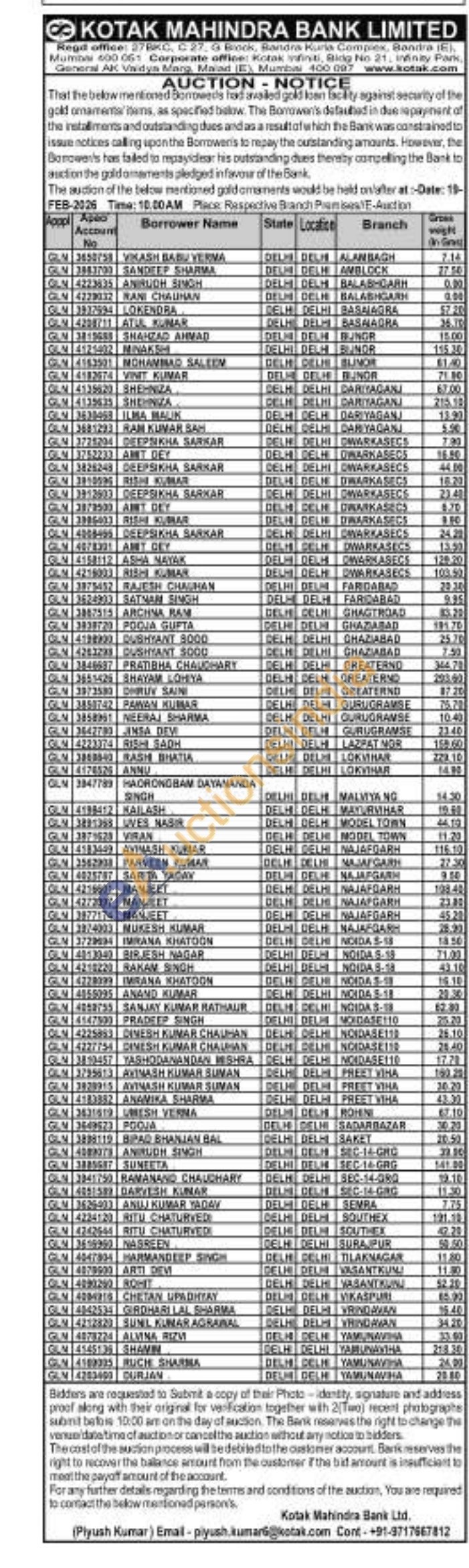 Kotak Mahindra Bank Gold Auctions Auction in New Delhi