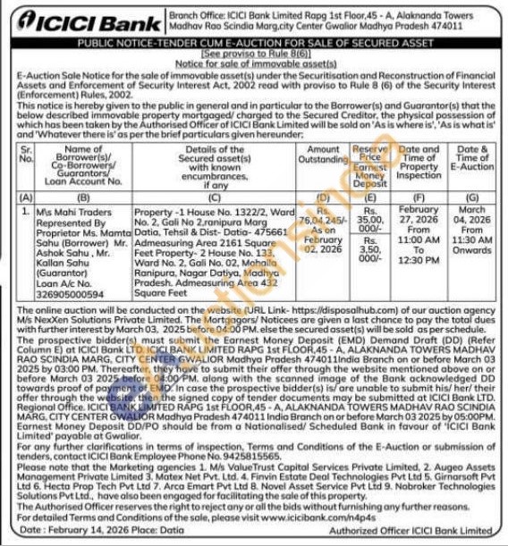 Property-1 House No. 1322/2, Ward No. 2, Gali No 2.ranipura Marg Datia, Tehsil & Dist-Datia-475661 Admeasuring Area 2161 Square Feet Property- 2 House No. 133, Ward No. 2. Gali No. 02, Mohalla Ranipura, Nagar Datiya, Madhya Pradesh. Admeasuring Area 432 Square Feet