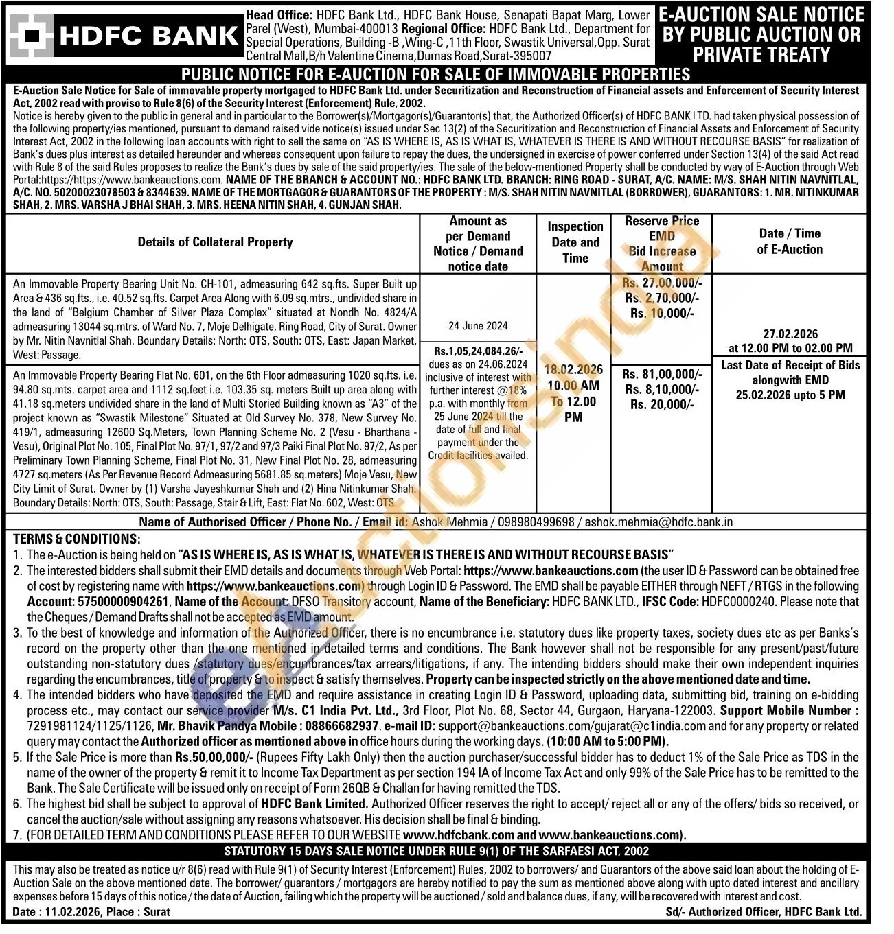 An Immovable Property Bearing Flat No. 601, on the 6th Floor admeasuring 1020 sq.fts. i.e. 94.80 sq.mts. carpet area and 1112 sq.feet i.e. 103.35 sq. meters Built up area along with 41.18 sq.meters undivided share in the land of Multi Storied Building known as "A3" of the project known as "Swastik Milestone" Situated at Old Survey No. 378, New Survey No. 419/1, admeasuring 12600 Sq.Meters, Town Planning Scheme No. 2 (Vesu - Bharthana-Vesu), Original Plot No. 105, Final Plot No. 97/1, 97/2 and 97/3 Paiki Final Plot No. 97/2, As per Preliminary Town Planning Scheme, Final Plot No. 31, New Final Plot No. 28, admeasuring 4727 sq.meters (As Per Revenue Record Admeasuring 5681.85 sq.meters) Moje Vesu, New City Limit of Surat. Owner by (1) Varsha Jayeshkumar Shah and (2) Hina Nitinkumar Shah. Boundary Details: North: OTS, South: Passage, Stair & Lift, East: Flat No. 602, West: OTS.