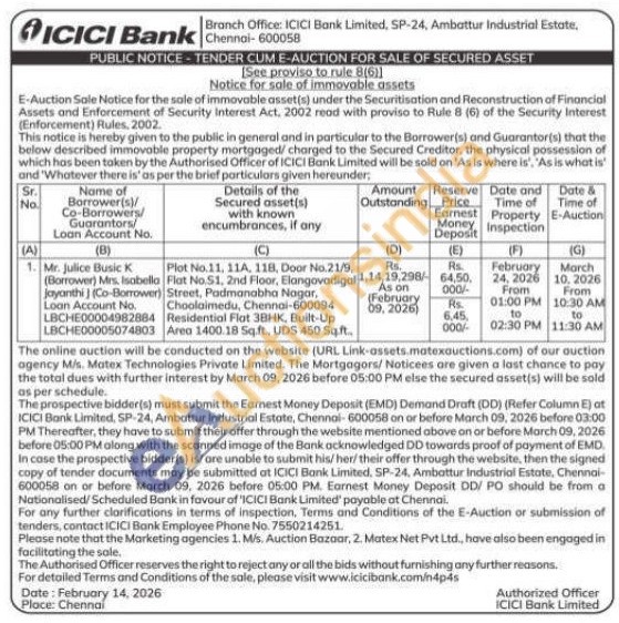 Plot No.11. 11A, 118, Door No.21/9, Flat No.51, 2nd Floor, Elangovadigal Street, Padmanabha Nagor, Choolaimedu, Chennai-600094 Residential Flat 3BHK, Built-Up Area 1400.18 Sq.ft., UDS 450 Sq.ft.