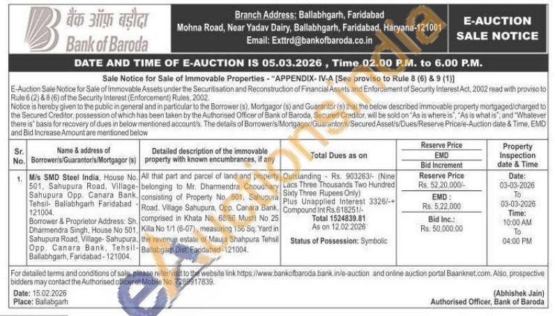 All that part and parcel of land and property belonging to Mr. Dharmendra Choudhary consisting of Property No. 501, Sahupura Road. Village Sahupura. Opp. Canara Bank. comprised in Khata No. 68/86 Mustil No 25 Killa No 1/1 (6-07), measuring 156 Sq. Yard in the revenue estate of Mauja Shahpura Tehsil Ballabgarh Dist. Faridabad-121004