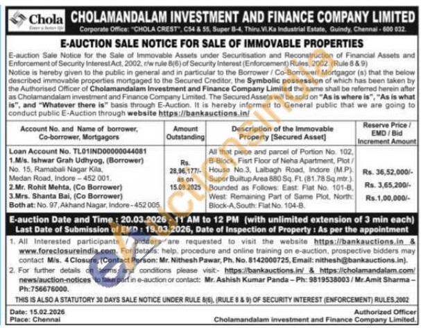 All that piece and parcel of Portion No. 102, B-Block, Fisrt Floor of Neha Apartment, Plot/House No.3, Lalbagh Road, Indore (M.P) Super Builtup Area 880 Sq. Ft. (81.78 Sq.mtr.) Bounded as Follows: East: Flat No. 101-8. West: Remaining Part of Same Plot, North: Block-A,South: Flat No. 104-8.