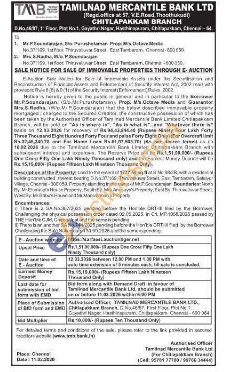 Description of the Property: Land to the extent of 1777.50 sq.ft at S. No.98/28, with a residential building constructed thereat bearing D. No.37/169, Thiruvalluvar Street. East Tambaram, Selaiyur Vilage, Chennai-600 059. Property standing in the name of Mr. P.Soundarajan. Boundaries: North By: Mr.Elumala's House Property, South By Mrs. Anusuya's Property, East By: Thiruvalluvar Street West By: Mr. Babu's House and Mr. Manivannan's Property.