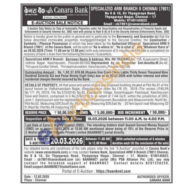 DETAILS OF PROPERTY: All that piece and parcel of land and proposed building situated at Plot No.61 of the layout known as Vedhamanickam Nagar, (Regularisation order No.176 (R) 2018 (The revises LP/KLPA No.171 (R) /2018, File No.575/2018) No.62, Kaarapettai Village, Konerikuppam Panchayat, Kanchipuram Taluk and District, comprised in S No.378/1018 to an extent of 1144 Sq.ft. within the jurisdiction of SRO, Joint 1, Kanchipuram and the registration district of Kanchipuram, Boundaries and Measurements: North By: Plot No.62, Measuring 52ft, South By: Plot No.60, Measuring 52ft, East By:20 feet layout road Measuring 22 It. West By: Plot No.44 measuring 22 t