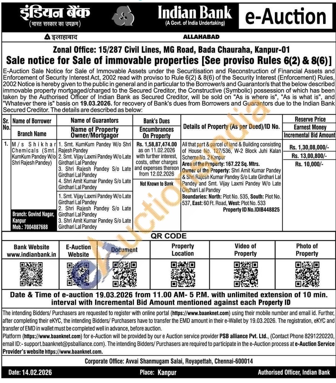 All that part & parcel of land & Building consisting of House No. 127/536, W-2 Block Juhi Kalan Scheme No. 2 Kanpur Area of the Property: 167.22 Sq. Mtrs. Owner of the Property: Shri Amit Kumar Pandey & Shri Rajesh Kumar Pandey S/o Late Girdhari Lal Pandey and Smt. Vijay Laxmi Pandey W/o Late Girdhari Lal Pandey Boundaries: North: Plot No. 535, South: Plot No. 537, East: 60 Ft. Road, West: Plot No. 533