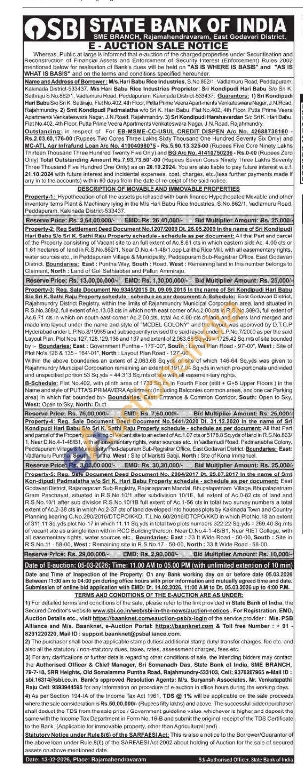 East Godavari District, Rajahmundry District Registry, within the limits of Rajahmundry Municipal Corporation area, land situated in R.S.No.388/2, full extent of Ac. 13.08 cts in which north east corner of Ac.2.00 cts in R.S.No. 389/3, full extent of Ac.6.71 cts in which on south east comer Ac.2.00 cts, total Ac.4.00 cts of land and others land merged and made into layout under the name and style of "MODEL COLONY" and the layout was approved by D.T.C.P Hyderabad under L.P.No.8/19965 and subsequently revised the said layout under L.P.No. 7/2000 as per the said Layout Plan, Plot Nos. 127, 128, 129, 136 and 137 and extent of 2,063.68 Sq.yds = 1725.42 Sq.mts of site bounded by: Boundaries: East: Government Puntha-176-00", South: Layout Plan Road-971-00", West: Site of Plot No's. 126 & 135-164-01", North: Layout Plan Road-127-00". Within the above boundaries an extent of 2,063.68 Sq.yds of site of which 146-64 Sq.yds was given to Rajahmundry Municipal Corporation remaining an extent of 1917.04 Sq.yds in which pro-portionate undivided and unspecified portion 53 Sq.yds = 44.313 Sq.mts of site with all easemen-tary rights. B-Schedule: Flat No.402, with plinth area of 1733 Sq.fts in Fourth Floor (stilt + G+5 Upper Floors) in the Name and style of PUTTA'S PRIMAVERA Apartment (Including Balconies common areas, and one car Parking area) in which flat bounded by:- Boundaries: East: Entrance & Common Corridor, South: Open to Sky. West: Open to Sky, North: Duct