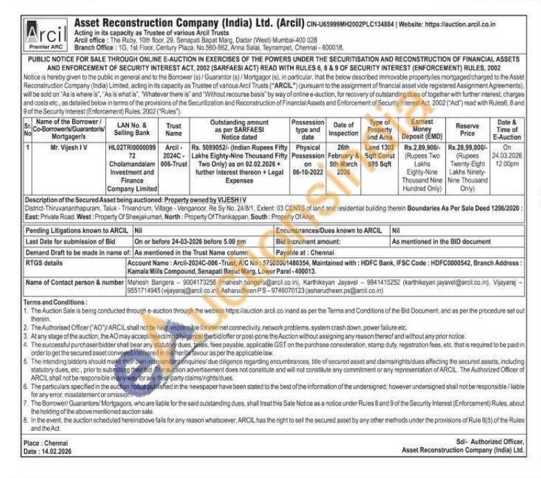 Description of the Secured Asset being auctioned: Property owned by VIJESHIV District-Thiruvananthapuram, Taluk-Trivandrum, Village-Venganoor, Re Sy No. 24/8/1, Extent: 03 CENTS of land and residential building therain Boundaries As Per Sale Deed 1206/2020 East: Private Road West: Property Of Sheejakuman, North: Property Of Thankappan, South: Property Of Arun