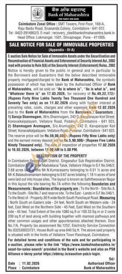 In Coimbatore Registration District, Singanallur Sub Registration District, Coimbatore Taluk, Now Madukkarai Taluk, Vellalore Village In S.F.No 546/2, 2.68 acres land in this Mr.N.Kumarasamy belonging to 0.51% acres and Mr.K.Balasubramaniam belonging to 0.67 acres totaling 1.18 % acres of land were laid out into house sites, The layout is known as Saththeswaran Nagar in this layout the site bearing No.7A within the following Boundaries and Measurements: Boundaries of the property are: To the North-Site No.8. To the South-Site No.7 and reserve site. To the East-Lands in S.F.No.546/1, To the West of Property 30 ft wide North South Panchayat Road. Measuring : North South on Eastern side-24 feet, North South on Western side-24 feet, East West on the Northern Side-45 Feet, East West on the Southern side-45 feet. Total Extent of the site 1080 sq.ft or 100.33 Sq.m or 2 cents 209 sq.ft of land along with building together with mamool pathways and other common usages and other appurtenances attached thereon. Door No.7/A, Property tax assessment No. 1252, Electricity Service Connection No. 032530023721, House Built-up area 840 Sq.ft. The above said property is situated with in the limits of Vellalore Town Panchayat, Coimbatore
