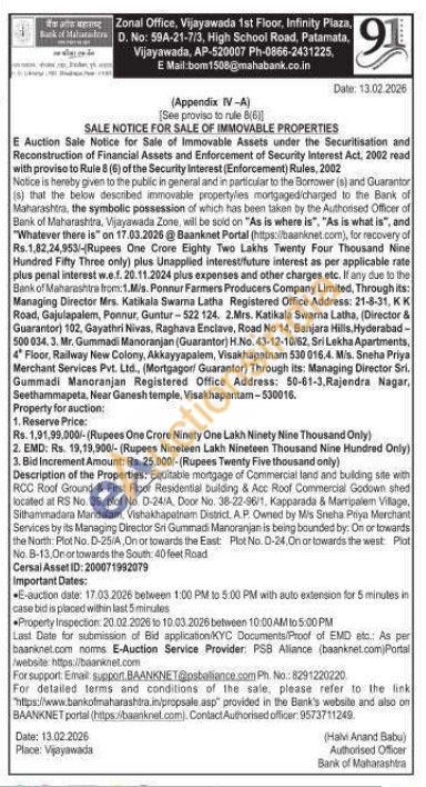 Description of the Properties: Equitable mortgage of Commercial land and building site with RCC Roof Ground & First Floor Residential building & Acc Roof Commercial Godown shed located at RS No. 39, plot No. D-24/A, Door No. 38-22-96/1, Kapparada & Marripalem Village, Sithammadara Mandalam, Vishakhapatnam District, AP. Owned by Mis Sneha Priya Merchant Services by its Managing Director Sri Gummadi Manoranjan is being bounded by: On or towards the North: Plot No. D-25/A, On or towards the East: Plot No. 0-24, On or towards the west Plat No. 8-13 On or towards the South: 40 feet Road
