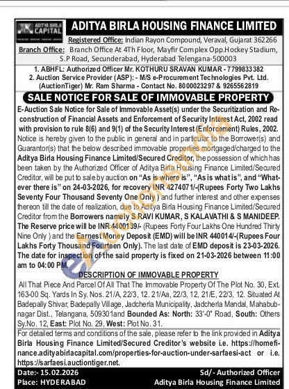 All That Piece And Parcel Of All That The Immovable Property Of The Plot No. 30, Ext. 163-00 Sq. Yards In Sy. Nos. 21/A, 22/3, 12. 21/Aa, 22/3, 12, 21/E, 22/3, 12. Situated At Badepally Shivar, Badepally Village, Jadcherla Municipality, Jadcheria Mandal, Mahabubnagar Dist., Telangana, 509301and Bounded As: North: 33-0" Road, South: Others Sy.No. 12, East: Plot No. 29, West: Plot No. 31