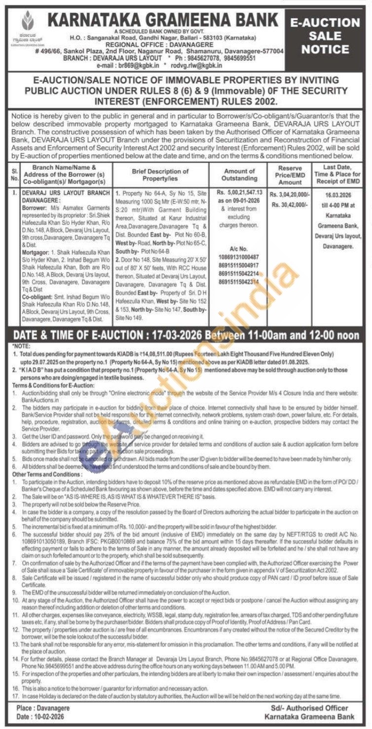 Property No 64-A. Sy No 15, Ste Measuring 1000 Sq Mir (E-W50 mtr N 5:20 mtr)With Garment Building thermon, Situated at Karur Industrial Area, Davanagere Davanagere To & Dist. Bounded East by Plot No 60-8 West by-Ruad, North by-Plot No 65-0 South by- Plot No 64-8