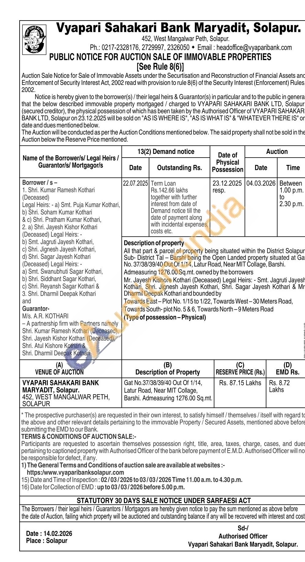 that part & parcel of property being situated within the District Solapur Sub-District Tal-Barshi being the Open Landed property situated at Ga No. 37/38/39/40 Out Of 1/14, Latur Road, Near MIT Collage, Barshi. Admeasuring 1276.00 Sq.mt. owned by the borrowers Mr. Jayesh Kishore Kothari (Deceased) Legal Heirs: - Smt. Jagruti Jayesh Kothari, Shri. Jignesh Jayesh Kothari, Shri. Sagar Jayesh Kothari & Mr. Dharmil Deepak Kothari and bounded by Towards East-Plot No. 1/15 to 1/22, Towards West-30 Meters Road, Towards South-plot No. 5 & 6, Towards North-9 Meters Road