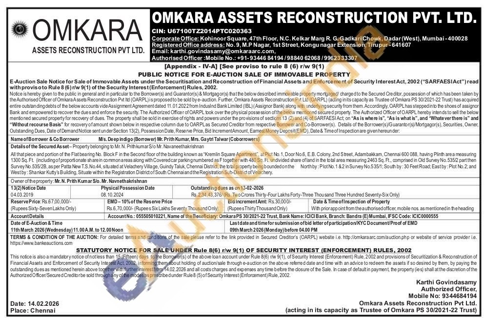 All that piece and portion of the Flat bearing No. Block F in the Second floor of the building known as "Kremlin Square Apartment", at Plot No. 1, Door No.6, E.B. Colony, 2nd Street, Adambakkam, Chennai 600 088, having Plinth are a measuring 1300 Sq. Ft. (including of proportionate sh are in common areas along with Covered car parking numbered as F together with 480 Sq. Ft. undivided share of land in the total area measuring 2463 Sq. Ft., comprised in Old Survey No.535/2 part then Survey No 535/28, as per Patta New T.S.No.44, situated at Velachery Village, Guindy Taluk, Chennai District, the total property being bounded on the Northby: Plot No. 1 & 2 in Survey No.535/1; South by: 30 Feet Road; East by: Plot No.2; and Westby: Shankar Kutty's Building, Situate within the Registration District of South Chennaiand the Registration Sub-District of Velachery.