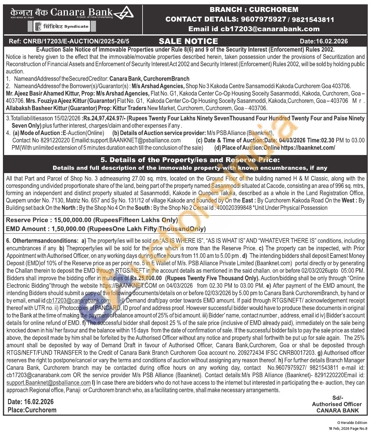 All that Part and Parcel of Shop No. 3 admeasuring 27.00 sq. mtrs, located on the Ground Floor of the building named H & M Classic, along with the corresponding undivided proportionate share of the land, being part of the property named Sasanmoddi situated at Cacode, consisting an area of 996 sq. mtrs, forming an independent and distinct property situated at Sasanmoddi, Kakode in Quepem Taluka, described as a whole in the Land Registration Office, Quepem under No. 7130, Matriz No. 657 and Sy No. 131/12 of village Kakode and bounded by On the East: By Curchorem Kakoda Road On the West: By Building set back On the North: By the Shop No 4 On the South: By the Shop No 2 Cersai ld: 400020399848 "Unit Under Physical Possession