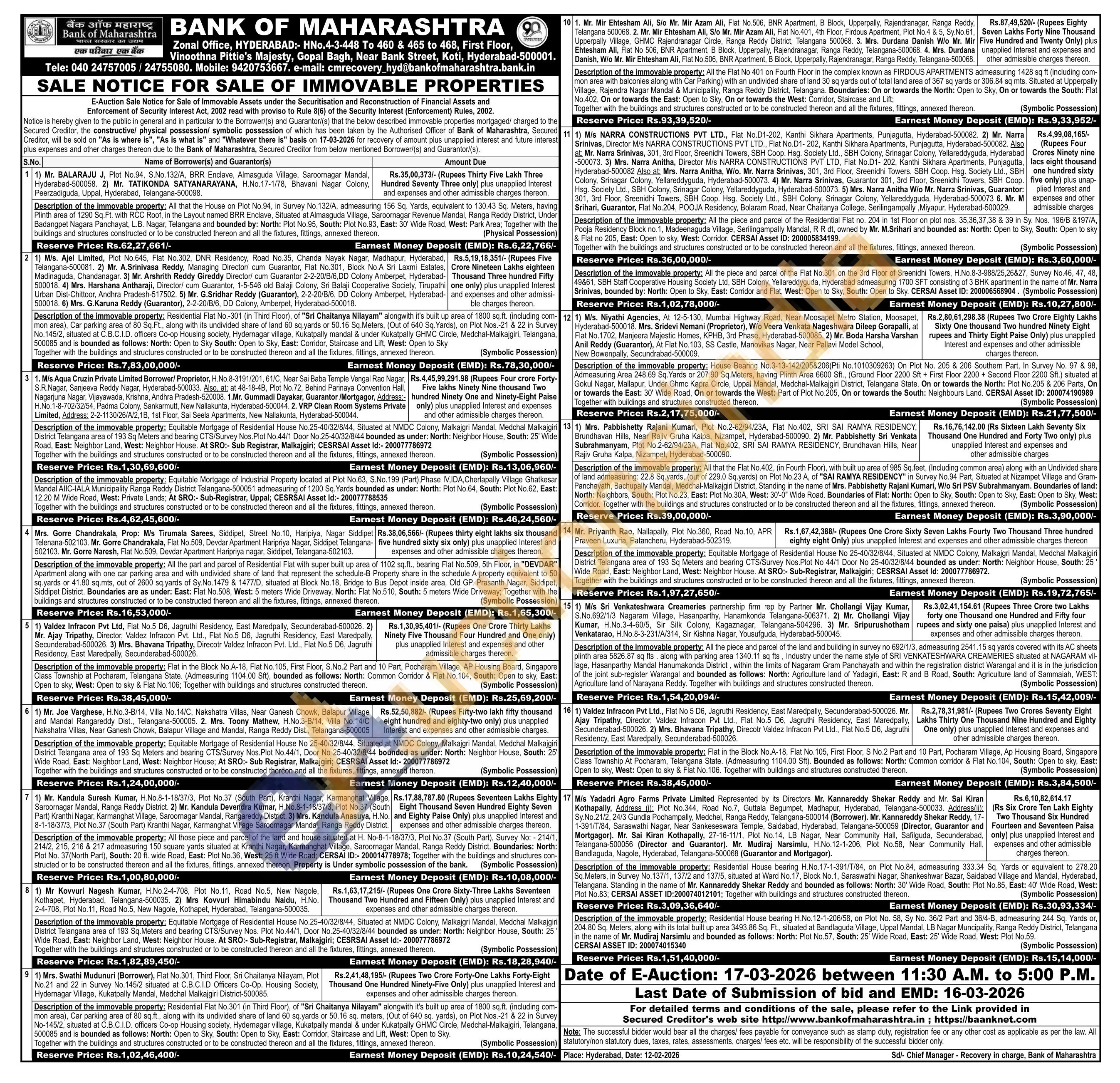 Description of the immovable property: Flat in the Block No.A-18, Flat No. 105, First Floor, S No.2 Part and 10 Part, Pocharam Village, Ap Housing Board, Singapore Class Township At Pocharam, Telangana State. (Admeasuring 1104.00 Sft). Bounded as follows: North: Common corridor & Flat No.104, South: Open to sky, East: Open to sky, West: Open to sky & Flat No. 106. Together with buildings and structures constructed thereon.