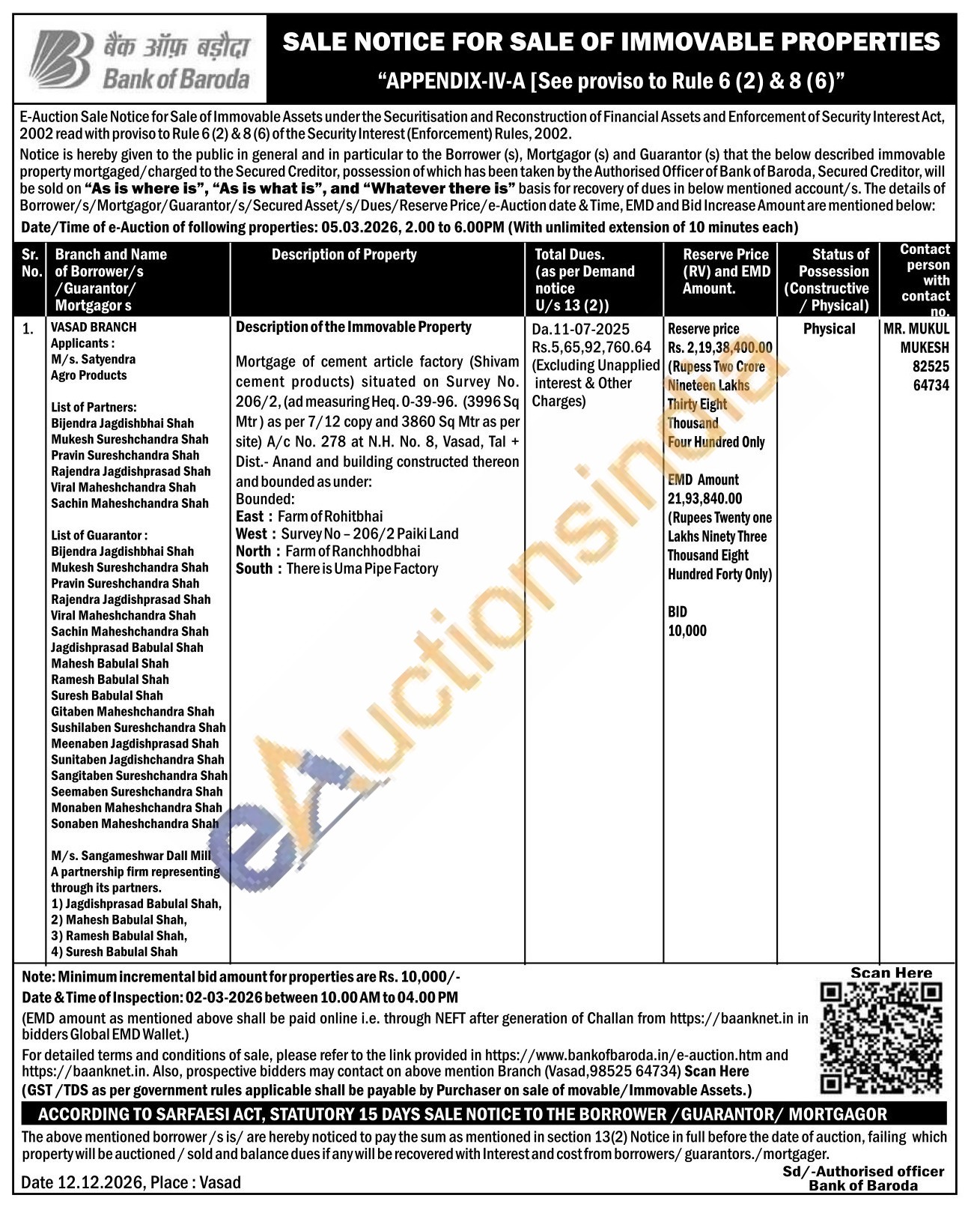 Mortgage of cement article factory (Shivam cement products) situated on Survey No. 206/2, (ad measuring Heq. 0-39-96. (3996 Sq Mtr) as per 7/12 copy and 3860 Sq Mtr as per site) A/c No. 278 at N.H. No. 8, Vasad, Tal + Dist.- Anand and building constructed thereon and bounded as under: