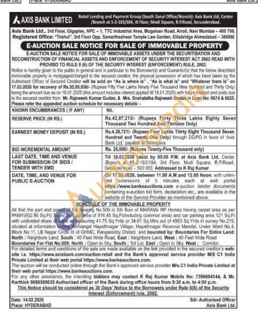 All that the part and parcel of flat bearing No 509 in 5th floor of MARAMS RP Homes having carpet area as per PAMY(602.86 Sq Ft) Super bull up area of 916.45 Sq. Ft(including common area) and car parking area 121 Sq Ft with undivided share of Land admeasuring 41.75 Sq. Yrds or 34-91 Sq Mtrs out of 4963 Sq. Yrds in survey No.219, situated at information colony, Anmangal Hayathnagar Village, Hayathnagar Revenue Mandal. Under Ward No.4, Block No. 11, LB Nagar Cele Ill of GHMC, Rangareddy District and bounded by: Boundaries For Entire Land: