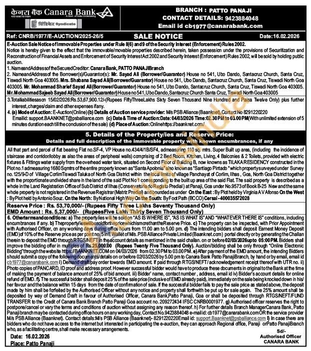 All that part and parcel of flat bearing Flat no.SF-4, VP House no.434/4/1B/SF4, admeasuring 110 sq. mtrs. Super Built up area, (including the incidence of staircase and corridor/lobby as also the areas of peripheral walls) comprising of 2 Bed Room, Kitchen, Living, 4 Balconies & 2 Toilets, provided with electric fixtures & Fittings water supply from the overhead water tank, situated on Second Floor of Building B, now knowns as TILAKARESIDENCY constructed in the Plot no.1 admeasuring 1680 Sqmtrs of the entire property known as "Santa Apolonia" also known as "Santiago Pintado "which property surveyed under Survey no. 125/9-D of Village Corlim Tiswadi Taluka of North Goa District within the local limits of village Panchayat of Corlim, Ilhas, Goa, North Goa District together with the proportionate undivided share in the land of the said Plot No 1 corresponding to the built up area of the said Flat. The said property is described as a whde in the Land Registration Office of Sub District of Ilhas (Conservatoria do Registo Predial) at Panaji, Goa under No.9573 of Book B-25 New and the same whde property is not registered in the Revenue Registrar (Matriz Predial) and bounded as under On the East: By Plot held by Virginia AV Afonso On the West : ByPlot held by Antonio Souz. On the North: By National High Way On the South: By Foot Path (BCCO) Cersal-400035572028