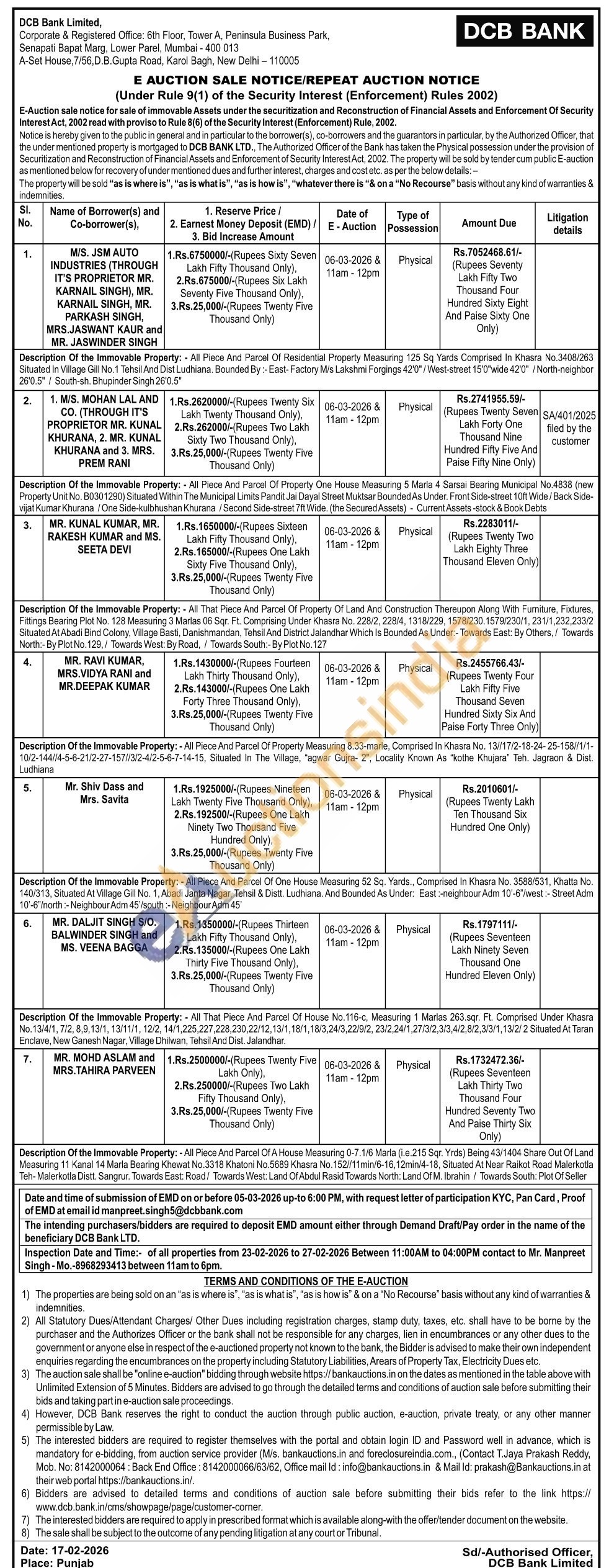 Description Of the Immovable Property: All Piece And Parcel Of Property One House Measuring 5 Marla 4 Sarsai Bearing Municipal No.4838 (new Property Unit No. B0301290) Situated Within The Municipal Limits Pandit Jai Dayal Street Muktsar Bounded As Under. Front Side-street 10ft Wide/Back Side-vijat Kumar Khurana/One Side-kulbhushan Khurana/Second Side-street 7ft Wide. (the Secured Assets) Current Assets-stock & Book Debts