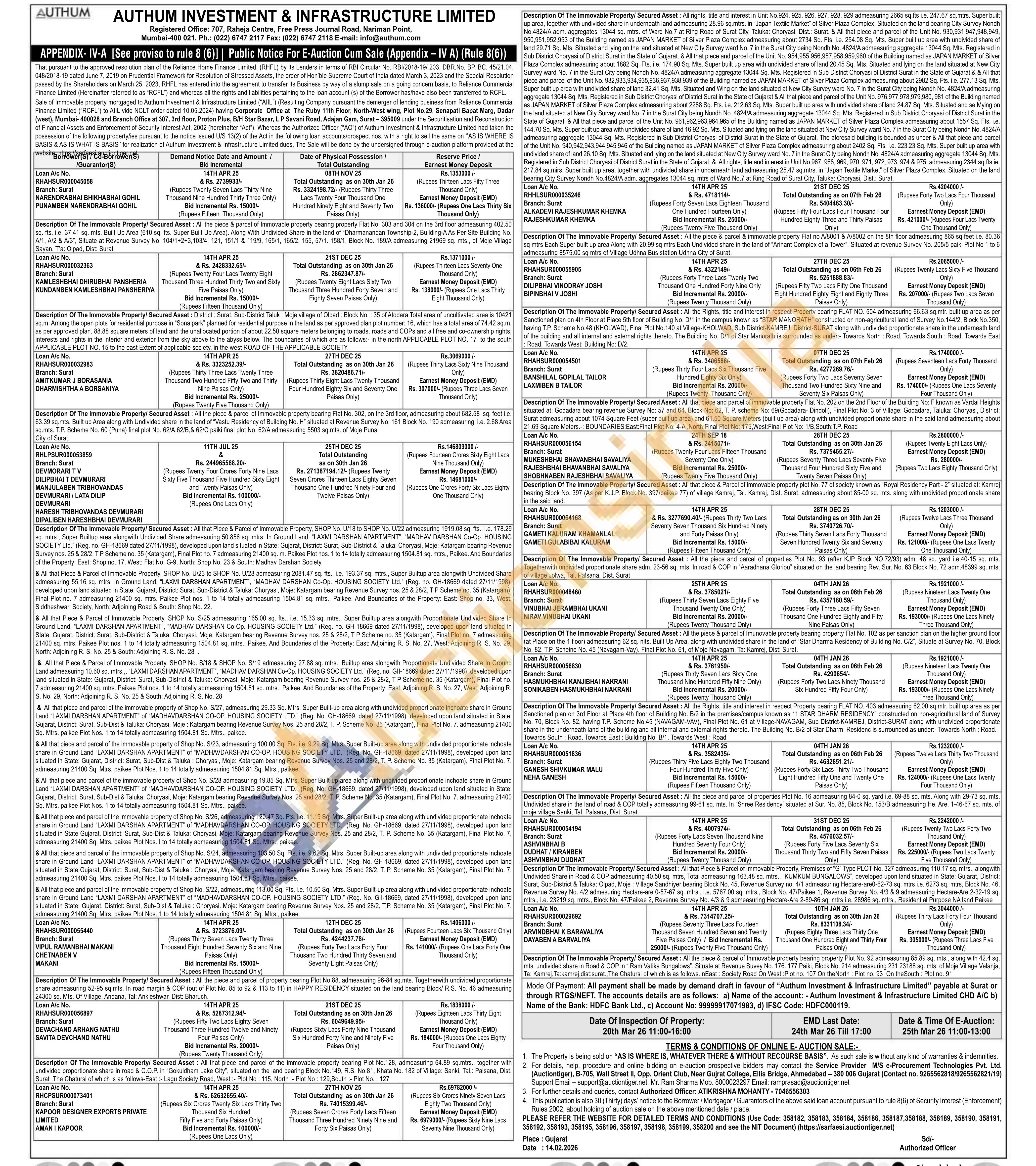 Description Of The Immovable Property/ Secured Asset: All the piece & parcel of Immovable property bearing property Plot No. 92 admeasuring 85.89 sq. mts., along with 42.4 sq. mts. undivided share in Road & COP in "Ram Vatika Bungalows", Situate at Revenue Suvey No. 176. 177 Paiki, Block No. 214 admeasuring 231 23188 sq. mts. of Moje Village Velanja, Ta: Kamrej, Ta:kamrej, dist:surat., The Chatursi of which is as follows.InEast: Society Road On West: Plot no. 107 On theNorth: Plot no. 93 On theSouth: Plot no. 91