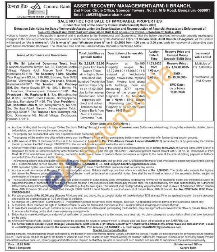 Property Property al No.195 unique No 152200401159020115 at situated Yelchahally Village, Yelwal Hobli, Mysuru Taluk, Mysuru land along with buildings there on measuring 3787 sq.mts Owner of the property Sri Raghava B S. bounded on North KHB, South Remaining Land, East Property of Sy No 96/3 And West: KHB Road.