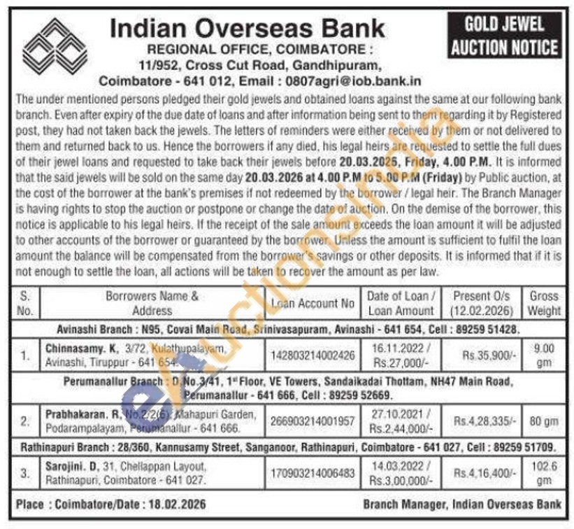 Indian Overseas Bank Gold Auctions Auction in Coimbatore